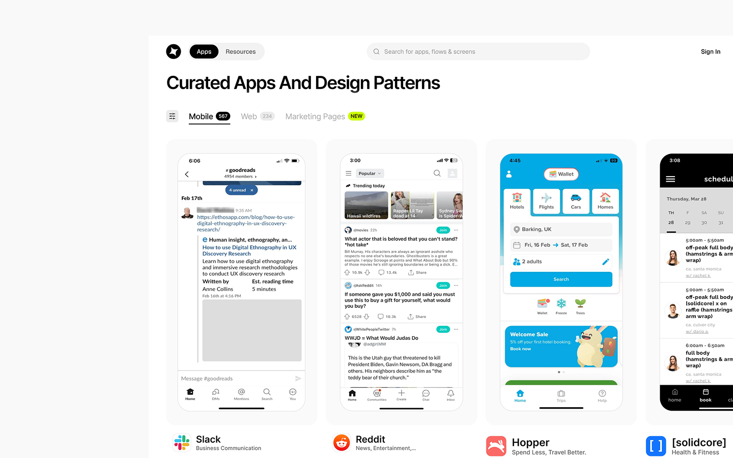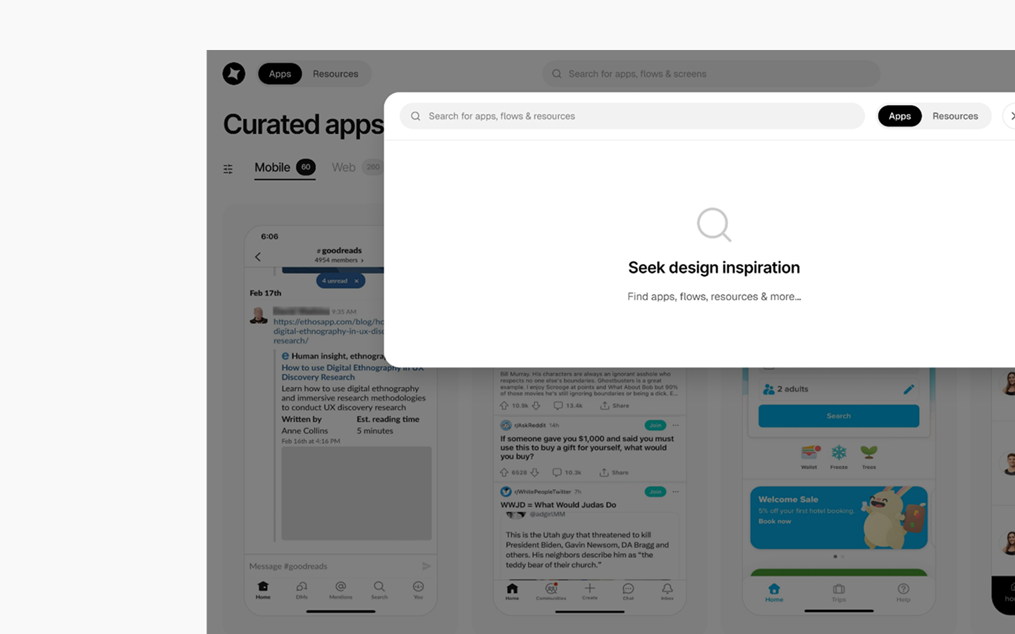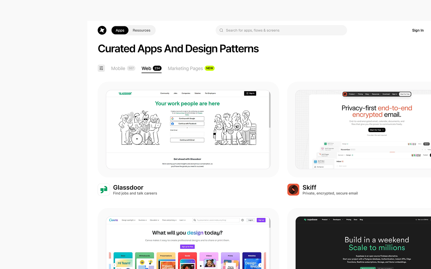 Design curation platform that helps designers and product teams discover real-world UI patterns, screens, and flows from the best apps and websites.